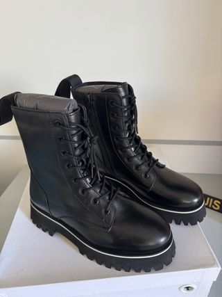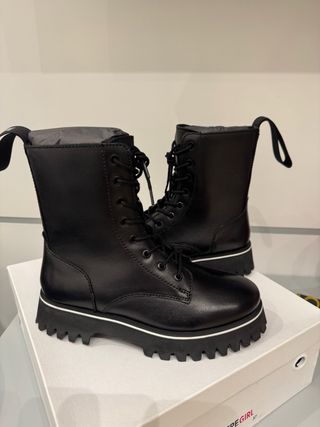 Stivaletti anfibi neri con suola chunky. - Tomaia in pelle e tessuto. - Chiusura con lacci. - Dettaglio in maglia sul collo del piede. - Tirante posteriore. - Centimetri in foto