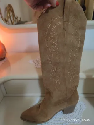 Stivali alti da donna in camoscio. - Materiale scamosciato; - Design con ricami; - Tacco comodo. Vendo per numero errato (37), nuove nella scatola, mai usate.