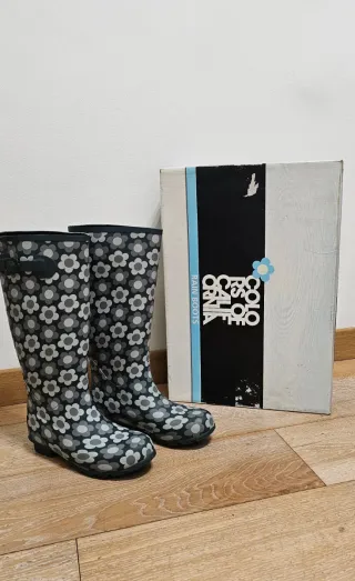 Stivali da pioggia con un allegro motivo floreale. Nuovi nai indossati - Fantasia verde azzurro con fiori grigi e bianchi. - Dettaglio con fibbia sul lato.