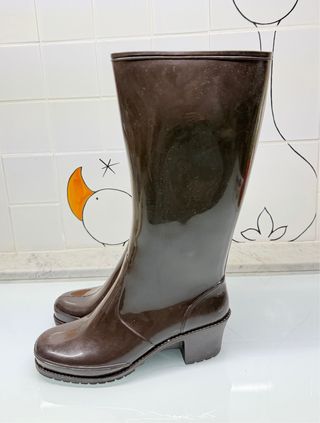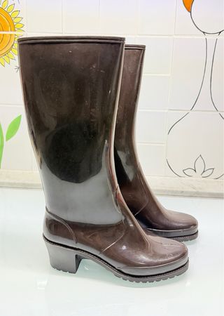 Stivali da pioggia marroni 37 Sarrazienne, usati 1 volta, suola in gomma, tacco cm 6, largo e comodo; gambale fino al tacco cm 35,5, senza cm30 Larghezza gambale cm 16,5 Interno caldo e foderato Nessuna usura #rainboots #stivalidapioggia #stivalidigomma #stivalimarroni #sarrazienne Eleganti stivali da pioggia con tacco, perfetti per le giornate uggiose - Modello alto al ginocchio - Finitura lucida - Suola robusta