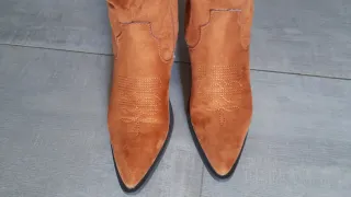 Stivali camperos in camoscio color cammello. Indossati 2 volte. - Design con ricami. - Modello alto fino al ginocchio.