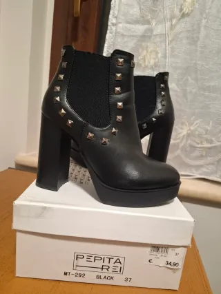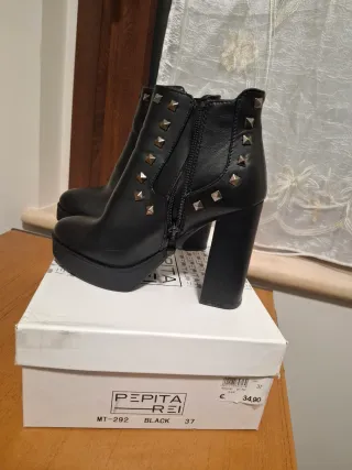 Tronchetto nero con borchie In similpelle Pagato 35€ e usato pochissimo Numero 37 Altezza tacco: 11cm Altezza plateau: 2,5cm Pepita Rei Acquistati a Globo Elegante tronchetto con tacco alto e plateau. - Design con borchie metalliche. - Zip laterale per facilitare la calzata. - Tacco largo e stabile.