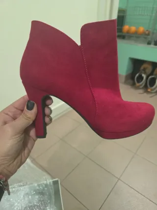 Eleganti stivaletti rossi con tacco sottile e plateau. - Materiale scamosciato. - Design a punta. - Chiusura laterale con cerniera.