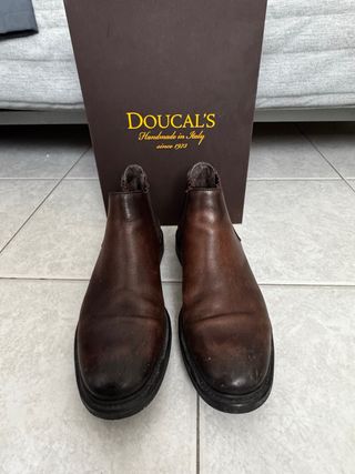 Stivaletti Windsor Smith usati e con segni di usura. La pelle esterna è in perfette condizioni, all'interno si è perso un po' il colore. La gomma sotto il tacco è stata rifatta da poco. Il tacco è un po' sciupato ma portandole da un calzolaio sono aggiustabili