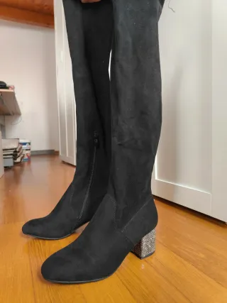 Eleganti stivali alti in camoscio nero. Perfetti per completare ogni outfit. Con zip laterale interna, lacci neri con fine corsa in metallo oro. Gambale cm 53,5 ripiegabile. Tacco cm 10. Praticamente nuovo, messo 2 volte in casa ancora con confezione originale e tendiscarpe per tenere la forma.Prezzo originale di acquisto nell'ultima immagine. - Materiale scamosciato. - Tacco comodo. - Design a punta.