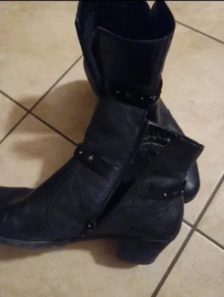 Eleganti stivaletti da donna con un design moderno,estremamente sono in buone condizioni all interno sono rovinate come mostrato in ultime foto,condizioni discrete. - Materiale: similpelle - Colore: nero - Chiusura laterale con zip - Tacco largo e plateau - Punta arrotondata