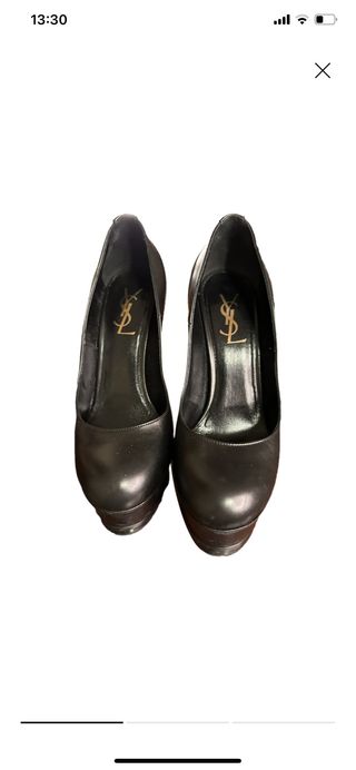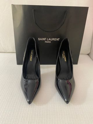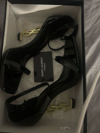 Eleganti tacchi con un design unico. - Colore nero lucido. - Dettagli dorati a forma di logo YSL. - Cinturino alla caviglia taglia 38
