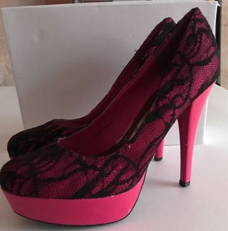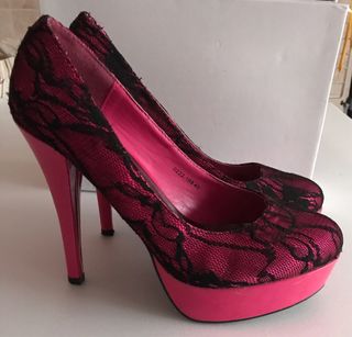 Scarpe in vernice e pizzo fuxia e nero con tacco alto 13 cm e plateau 3 cm