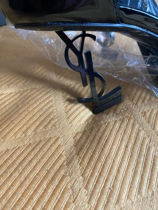 Eleganti tacchi Saint Laurent in vernice nera. - Design con cinturino alla caviglia. - Punta quadrata. - Dettagli a contrasto sulle fasce anteriori.