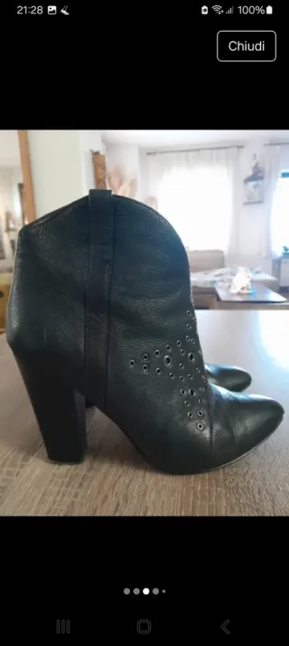 Eleganti stivaletti neri con dettagli traforati. - Presentano punte leggermente spellate,e tacchi consumati lateralmente,tutto documentato nelle foto. - Tacco 11 cm - Design a punta. - Zip laterale per facilitare la calzata. - Dettagli con occhielli metallici. - Senza scatola