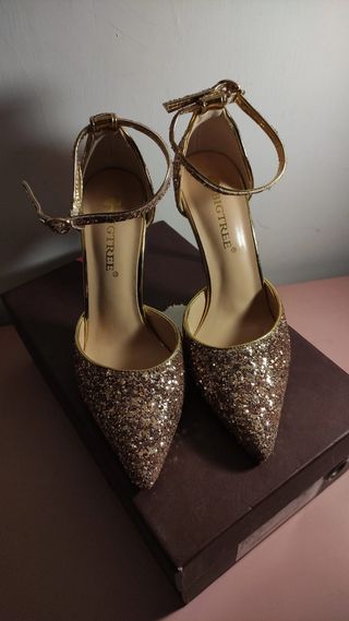 Tacchi color champagne, con decorazione sul tacco. Mai indossati, ottime condizioni. Le scarpe non sono proprio comode ma spiccano particolarmente. Cinturino regolabile, taglia 35(22.5cm), tacco 9.5cm. Accetto offerte in chat #shoes #heels #gold #champagne #élégant