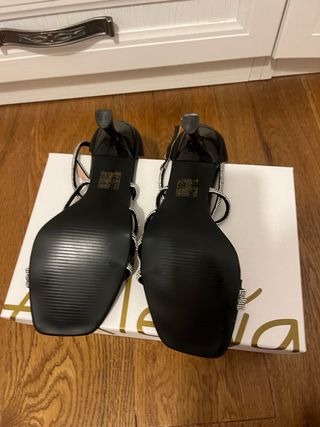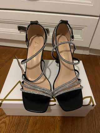 Eleganti tacchi neri con dettagli scintillanti, indossati solo una volta. - Cinturino alla caviglia con chiusura a fibbia. - Tacco sottile e . - Fascia anteriore decorata con strass -condizini pari al nuovo