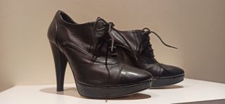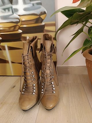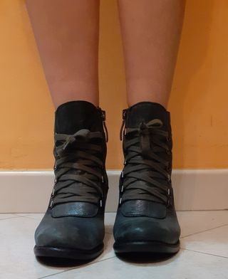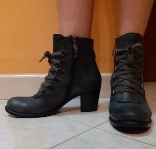 Stivaletti in morbidissima pelle grigia, effetto used. Cerniera interna di chiusura (i lacci sono solo decorativi). Suola in cuoio con mezza suola e tacco in gomma. Tacco h 6. Per essere un 35 veste decisamente comodo (io indosso il 35,5-36). Usate poco, ma naturalmente la suola è leggermente consumata ma nemmeno più di tanto (non è assolutamente da rifare al momento), il tacco un poco graffiato verso il basso; il colore del cursore della cerniera non è uniforme, ma era già così all'acquisto. Vendo perché non metto più i tacchi.