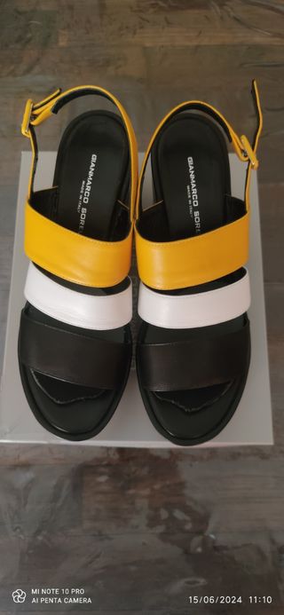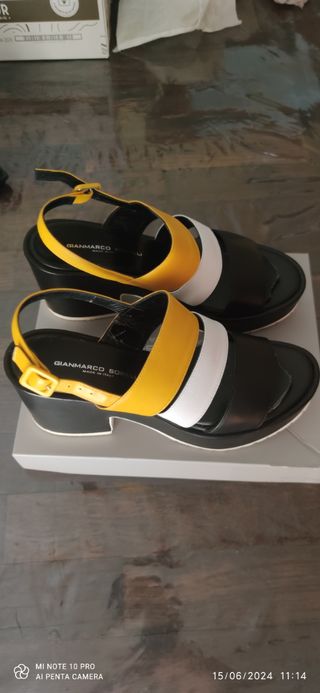Sandalo molto bello da vedere indossato, calza un n. 38, la base è in tessuto e il tacco in legno, i tacchi non hanno segni di usura. Belli e comodi