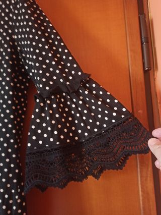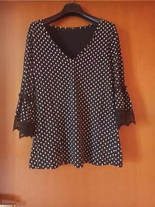 Maglietta a poins bianchi con manica a 3/4 profilata di merletto. Ottime condizioni!