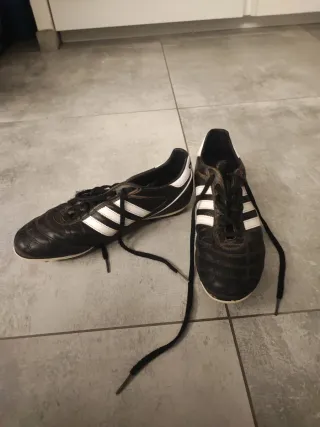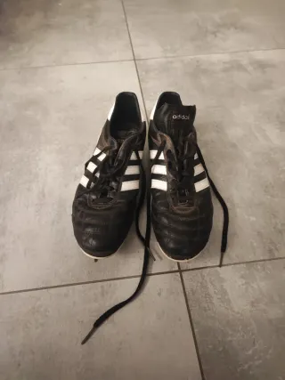 Scarpe da calcio Adidas. - Design classico con strisce bianche. - Tomaia in pelle nera. - Lacci neri.