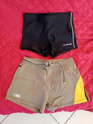 Set di due costumi da bagno per bambino/ragazzo. In entrambi è stata tagliata l'etichetta interna, come mostrato nelle foto. Tessuto sintetico.