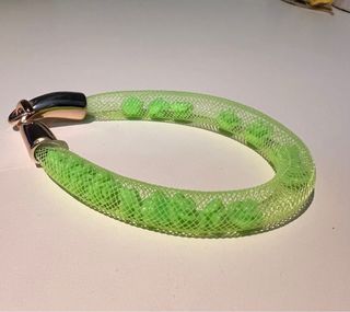 Elegante bracciale con una rete verde che racchiude al suo interno delle piccole rose. Chiusura color oro.