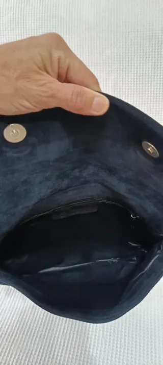 Bustina a mano elegante con un design moderno. - Materiale scamosciato. - Dettagli con pieghe sul davanti. - Manici ad anello in metallo argentato.