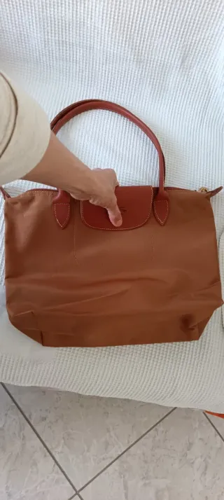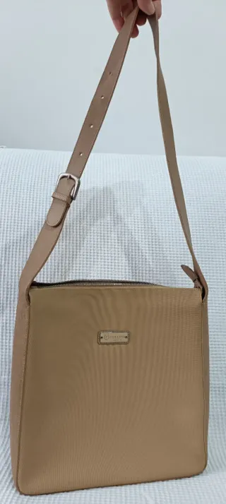 Borsa a spalla elegante con manici.In nylon e pelle. Marrone e cachi. - Materiale resistente. - Dettagli con zip. - Design moderno. É stata accorciata, ma venuta benissimo, come si vede dalle foto.