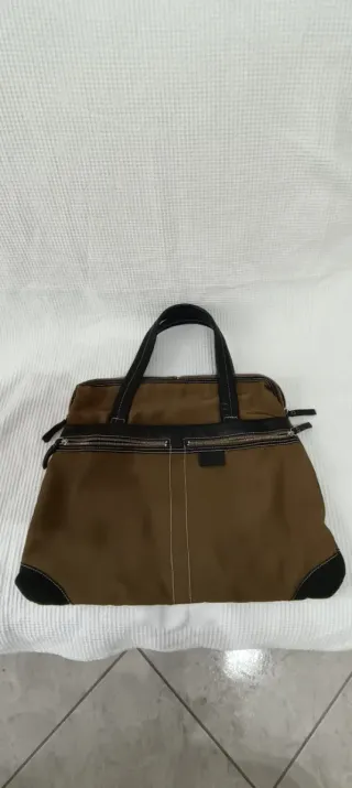 Borsetta elegante in tonalità beige e marrone. Usata poco, con segni del tempo. - Materiale pelle e nylon. - Tracolla corta, ma regolabile. - Dettaglio logo frontale.