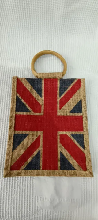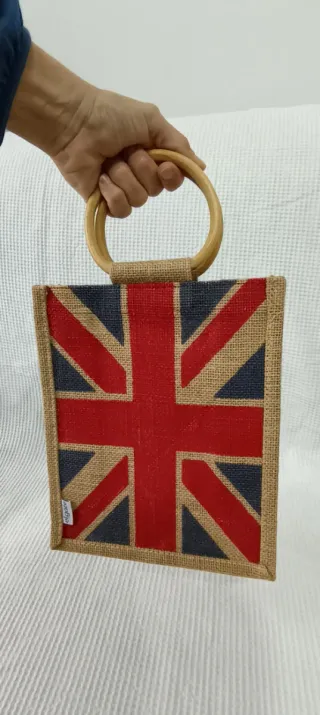 Borsa shopper con design Union Jack, perfetta per la spesa o come accessorio. Piccole dimensioni. - Materiale in juta resistente. - Manici in legno rotondi. - Stampa vivace della bandiera britannica.