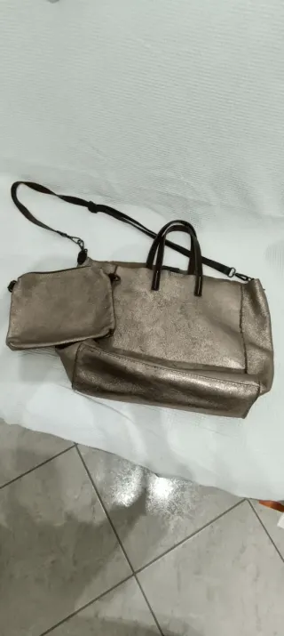 Borsa shopping da donna con pochette abbinata. Un accessorio versatile e alla moda. Segni di usura e moschettone rotto, ma comunque la tracolla si riesce ad utilizzare ugualmente. - Materiale effetto metallizzato. - Manici in pelle. - Tracolla regolabile e rimovibile. -Pochette internama indipendente.