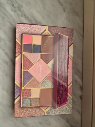 Trousse per il trucco con un design geometrico e colori vivaci. - Palette con diverse tonalità di ombretti e un fard. - Custodia esterna decorata con glitter e dettagli dorati. - Chiusura a scatto per la parte interna.