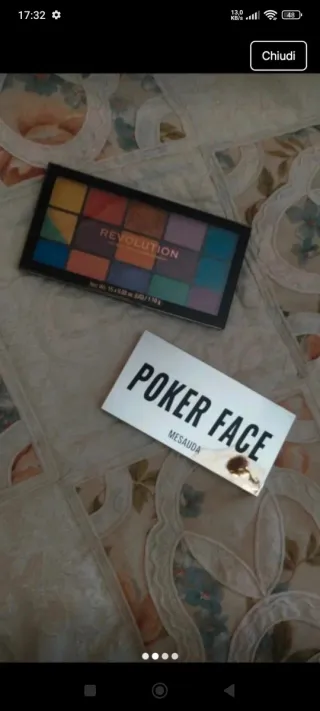 Vendo due palette di trucco, una Revolution e una Poker Face. - Palette Revolution con diverse colorazioni. - Palette Poker Face con tonalità neutre.