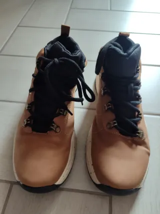 Scarpe da trekking MODELLO Timberland. - Tomaia in pelle scamosciata marrone. - Dettagli neri. - Suola bicolore.