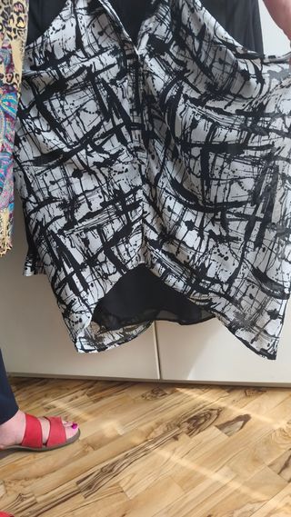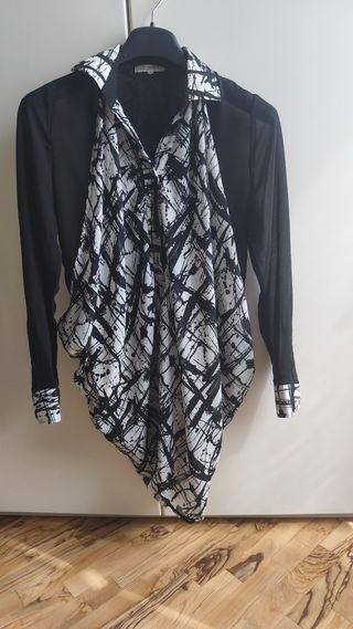 Camicia da donna con un design unico e un motivo astratto. Made in Italy 100% poliestere Spalle 38 cm Manica 60 cm Sottoacelle 46 cm Lunghezza nero 70 cm Lunghezza bianca 90 cm - Maniche lunghe. - Colletto classico. - Fantasia astratta in bianco e nero.