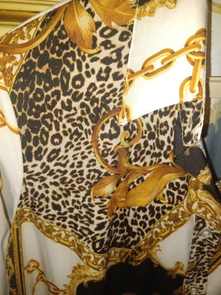 Elegante camicia con una stampa unica che unisce motivi dorati e animalier. - Fantasia barocca con catene e dettagli leopardati. - Colletto classico e chiusura con bottoni. - Maniche a 3/4.