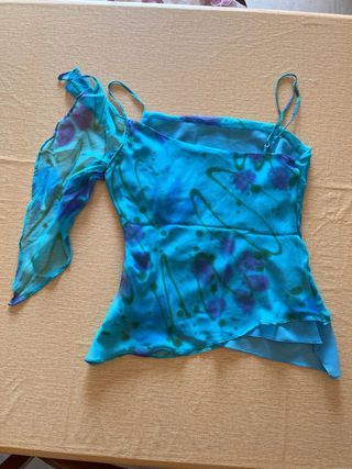 Bellissimo top estivo del marchio Yell Industry, in una vivace tonalità di azzurro. La fantasia multicolor è data da un ricco ricamo floreale, pietre e raffinate paillettes. - Perfetto per le serate estive, eventi, occasioni speciali, cocktail e serate da ballo - Il tessuto è leggero e arioso. - spalline sottili di cui una regolabile (destra) per eventuale effetto asimmetrico, spallina fissa sinistra e volant sotto il braccio sinistro.