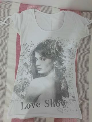 •T-shirt bianca. •Scollo rotondo. •Maniche corte con lacci laterali da annodare. •Stampa di una donna e scritta "love show" sul davanti. •Il retro è semplice, a tinta unita. •Difetto: ascelle leggermente ingiallite Taglia L ⚠️Potete fare anche offerte⚠️