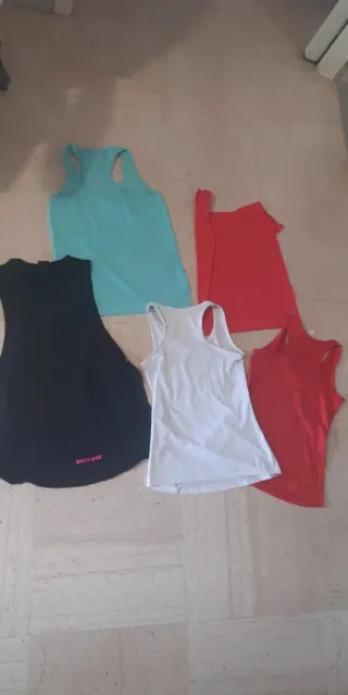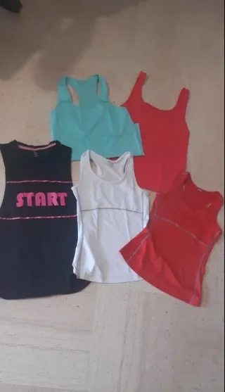 Lotto di 5 top sportivi da donna. - Top nero con scritta START rosa. - Top bianco con dettagli grigi. - Top rosso con dettagli grigi. - Top azzurro. Taglie M/L