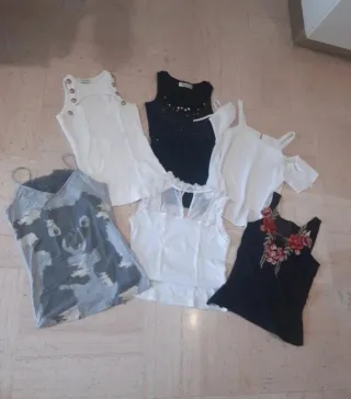 Lotto di magliette da donna. - Maglietta bianca con bottoni. - Maglietta nera con paillettes. - Maglietta bianca con spalle scoperte. - Maglietta grigia con stampa di koala. - Maglietta bianca con pizzo. - Maglietta nera con ricamo floreale.