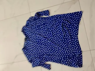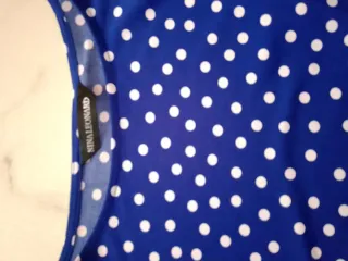 Maglia da donna con un vivace motivo a pois. - Fantasia a pois bianchi su sfondo blu. - Taglio comodo e versatile.
