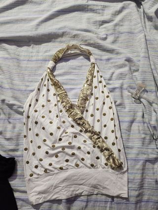 Elegante top da donna con un design unico. - Fantasia a pois dorati su base bianca. - Dettagli scintillanti con paillettes sul collo.piccola Riga scura ,si nota appena,vedi foto,visto piaciuto - Modello con scollo all'americana e schiena scoperta