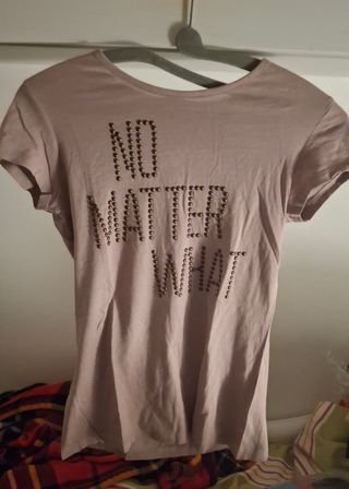 T-shirt da ragazza (11, 12, 13, 14 anni), color malva/rosa antico, caratterizzata da un design fronte/retro: borchie metalliche che formano la scritta "NO MATTER WHAT" sul davanti, e un grande centrino di pizzo all'uncinetto applicato sulla schiena.