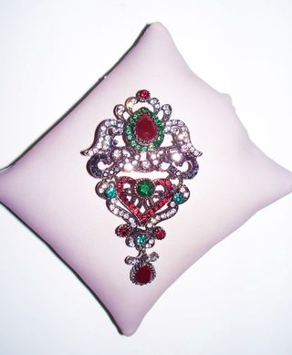 Portachiavi con ciondolo a forma di borsa. - Dettagli con motivo floreale e monogramma. - Tracolla rosa con decorazioni colorate.