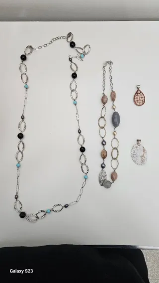 Set di collane da donna con dettagli in oro e pietre verdi. Singole 2€, set euro 5 - Collana lunga con pietre verdi. - Collana con perle e dettagli grigi. - Collana con perline corallo. - Collana con sfere arancioni. - Collana con perline grigie e azzurre.