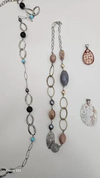 Set di collane e cammei realizzati in argento 925. - Collana lunga con perle nere e turchesi. - Collana con pietre colorate e ciondoli. - Due cammei con dettagli floreali. Condizione piu che buone solo la collana piu lungha non ha il punzone ma e stata testata come si vede nell'ultima foto