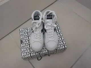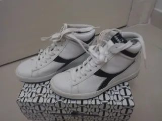 Sneakers alte Diadora da donna, un classico intramontabile. - Tomaia in pelle bianca con dettagli neri. - Design a taglio alto per un look sportivo. - Chiusura con lacci bianchi.