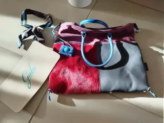 Bellissima borsa Gabs modello G3, un accessorio versatile e di tendenza. - Design patchwork con inserti in cavallino. - Manici e dettagli in pelle blu. - Tracolla regolabile e removibile. - Tasca esterna con bottone a pressione.