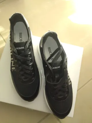 Sneakers Rucoline modello Evolve. - Tomaia in tessuto tecnico nero. - Dettagli in argento. - Suola bianca.