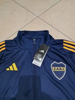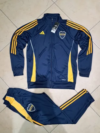 Completo set sportivo del Boca Juniors, composto da giacca e pantaloni. - Giacca con zip frontale e colletto alto. - Pantaloni con elastico in vita. - Logo del Boca Juniors sul petto e sulla gamba. - Strisce Adidas sulle maniche e sui lati dei pantaloni.