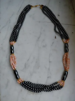 Elegante collana realizzata con perle di corallo rosa e pietre di ematite. Un gioiello unico che aggiunge un tocco di colore e raffinatezza. - Perle di corallo rosa. - Pietre di ematite - Chiusura dorata in metallo.