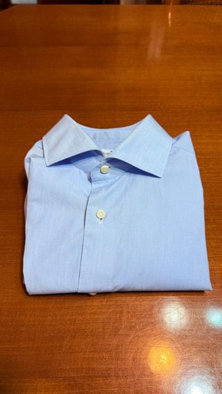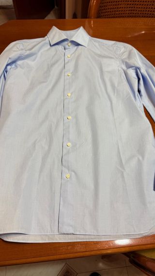 Bellissima e chicchissima camicia sartoriale di Giampaolo in cotone celeste la e taglia 40 pari a 15 e 3/4 di collo come nuova usata un paio di volte con collo alla francese bottone in madreperla pence posteriori e polsini arrotondati la camicia non presenta nessun segno di usura o difetti essendo utilizzata pochissimo ‚le misure sono collo 15 e 3/4 spalle 44 cm torace 54 cm lunghezza maniche 66 cm ….camicia bellissima