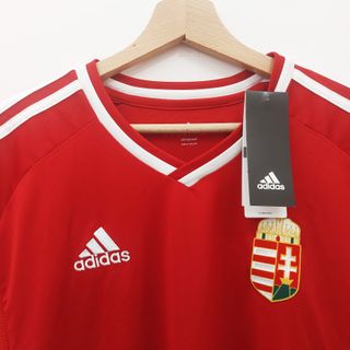 T-shirt nazionale di calcio Ungheria in casa, prodotta da Adidas nel periodo 2016-2018. Colore rosso con 3-stripes bianche e loghi ricamati. Nuova con cartellino. Taglia L Larghezza spalle: 52 Larghezza petto: 54 Lunghezza maniche: 26 Lunghezza totale: 76 Climacool 100% poliestere