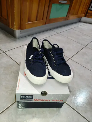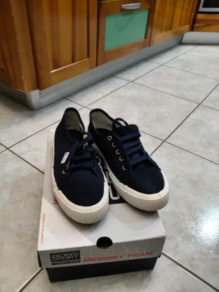 Scarpe basse da donna in tela usate solo una volta. Scatola non compresa - Tomaia in tessuto blu. - Suola in gomma bianca. - Chiusura con lacci. - Dettaglio logo sulla linguetta.